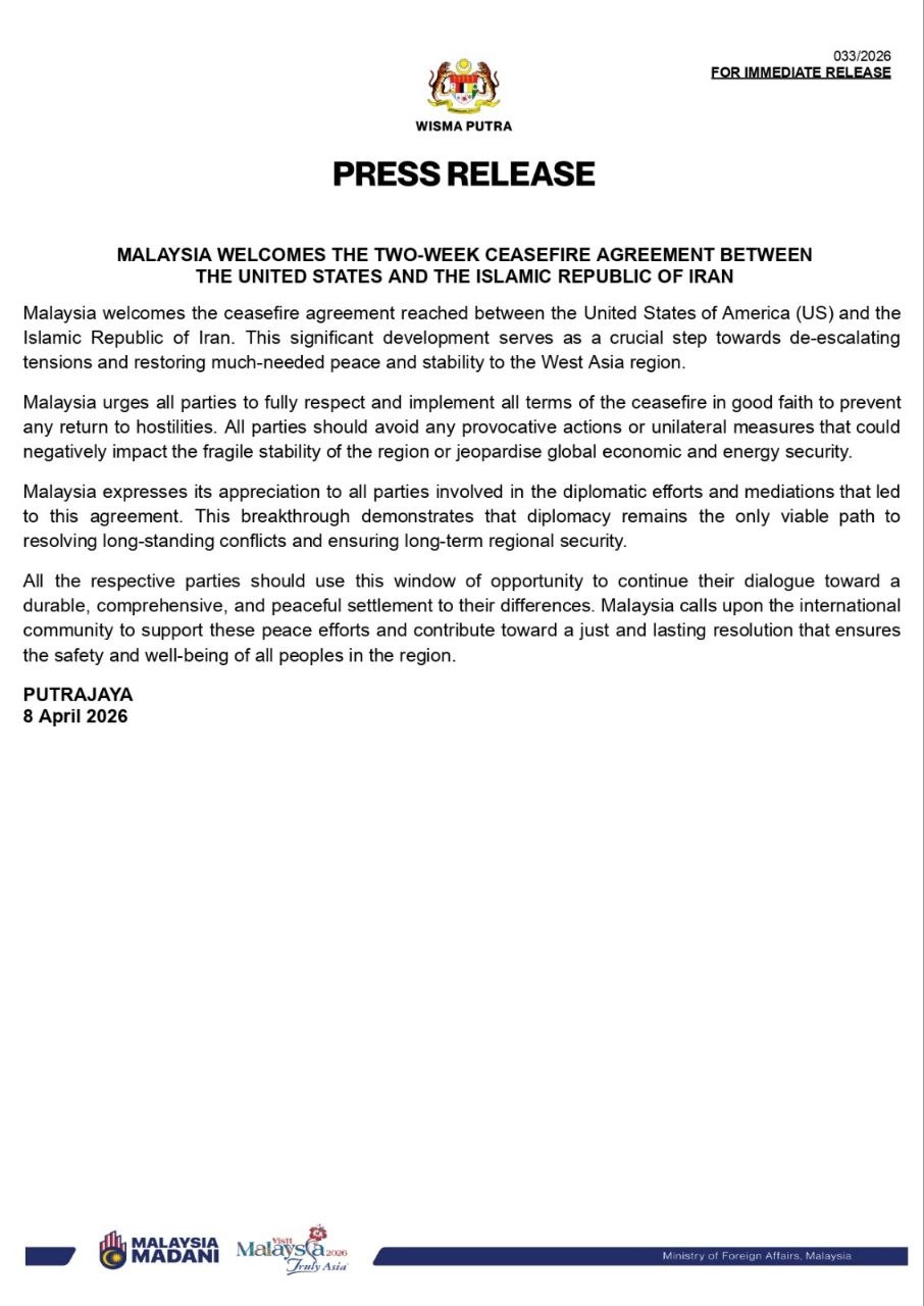 Malaysia's Foreign Ministry said in a statement on Wednesday April 8, 2026 that it welcomes the two-week ceasefire agreement between the United States and Iran. The ministry said the important development is an important step towards reducing tensions and restoring much-needed peace and stability to the West Asian region...